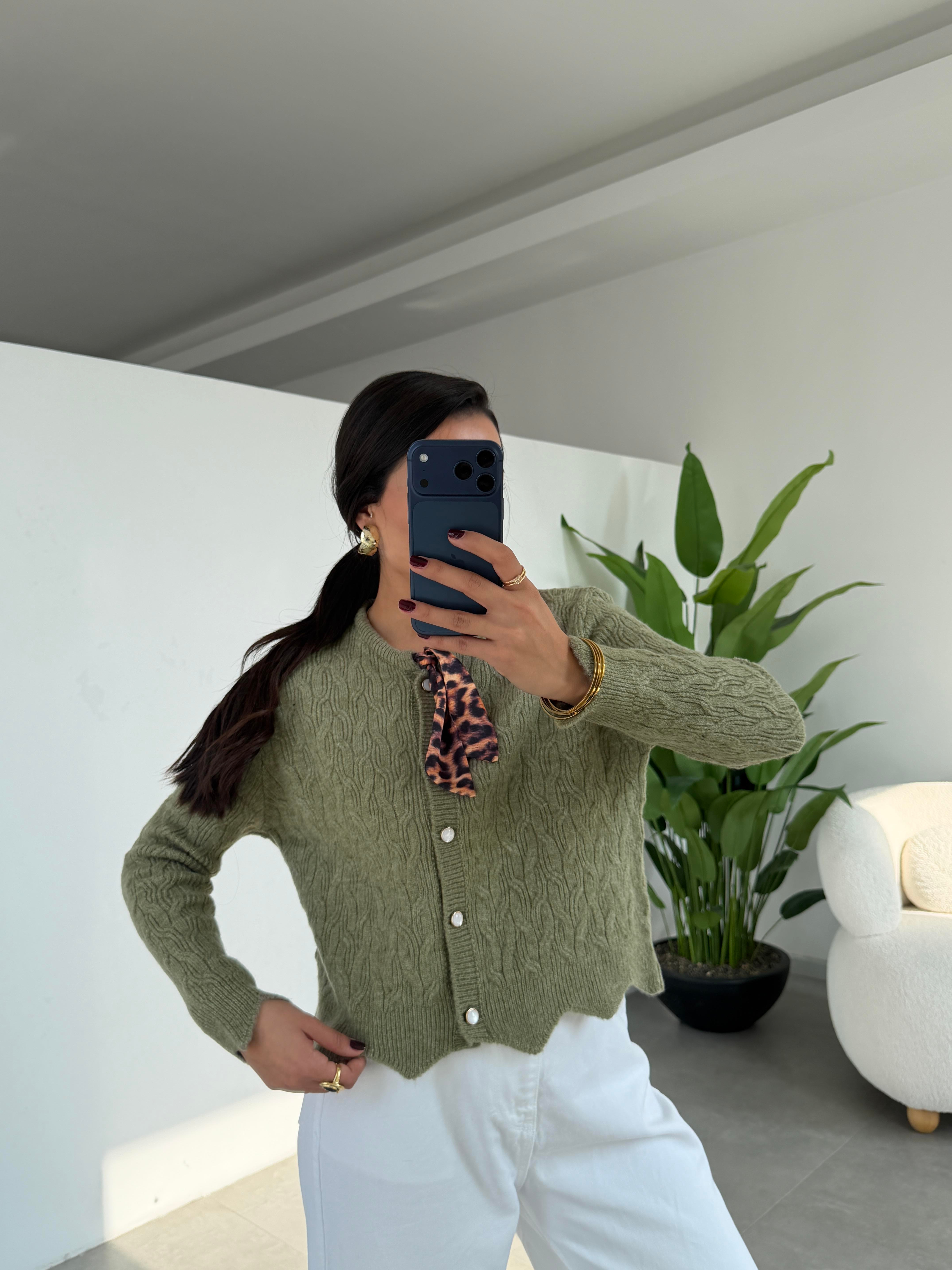 Yumuşacık örgü kumaşı, inci düğmeleri ve zarif leopar desenli fuları ile feminen bir zarafet sunar.