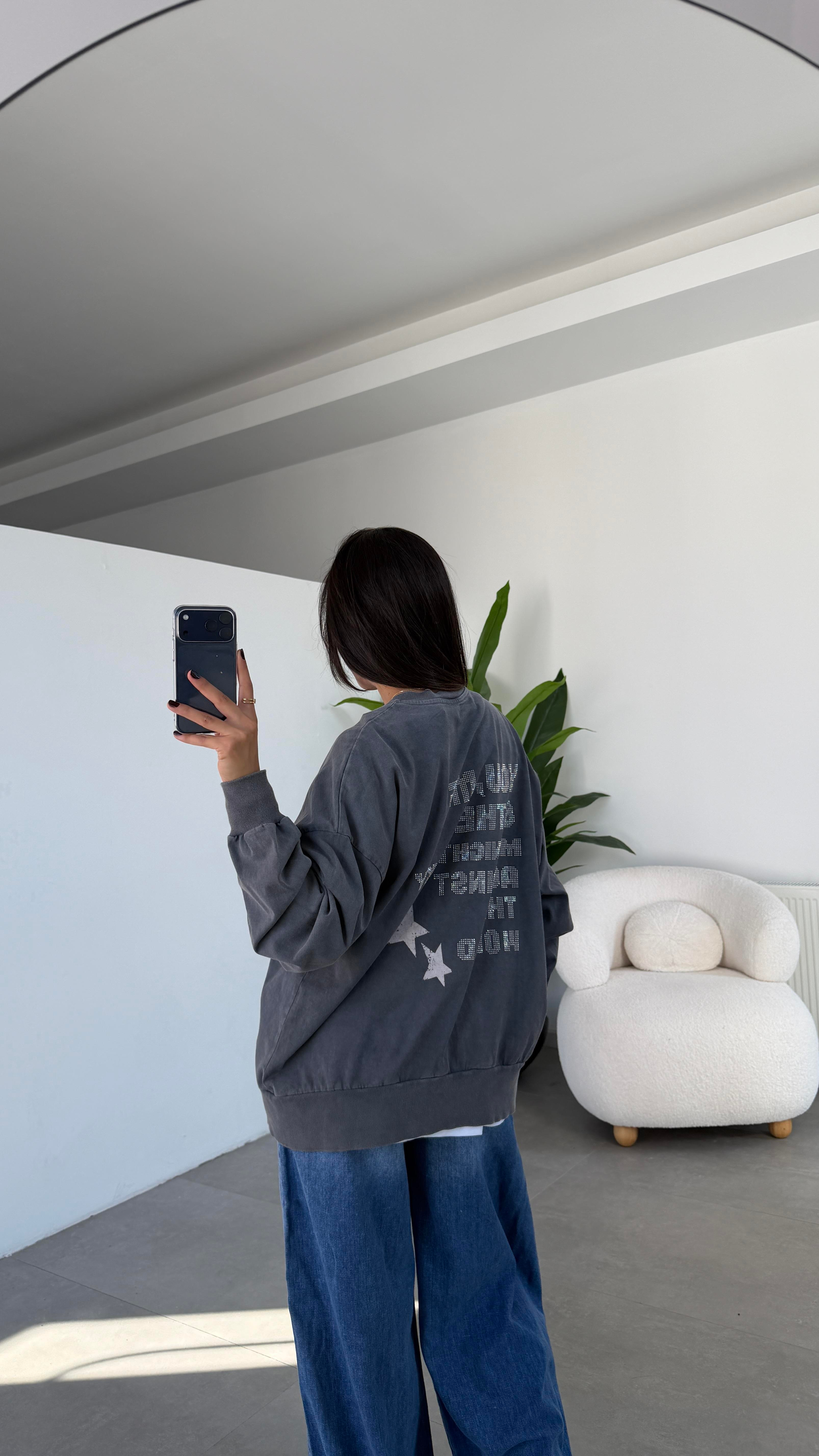Yıkamalı efektli kumaşı ve oversize duruşuyla hem salaş hem de stil sahibi bir görünüm sunar. “THE REAL LOVE STORY” minimal yazı detayıyla sade ama anlamlı bir dokunuş katar.