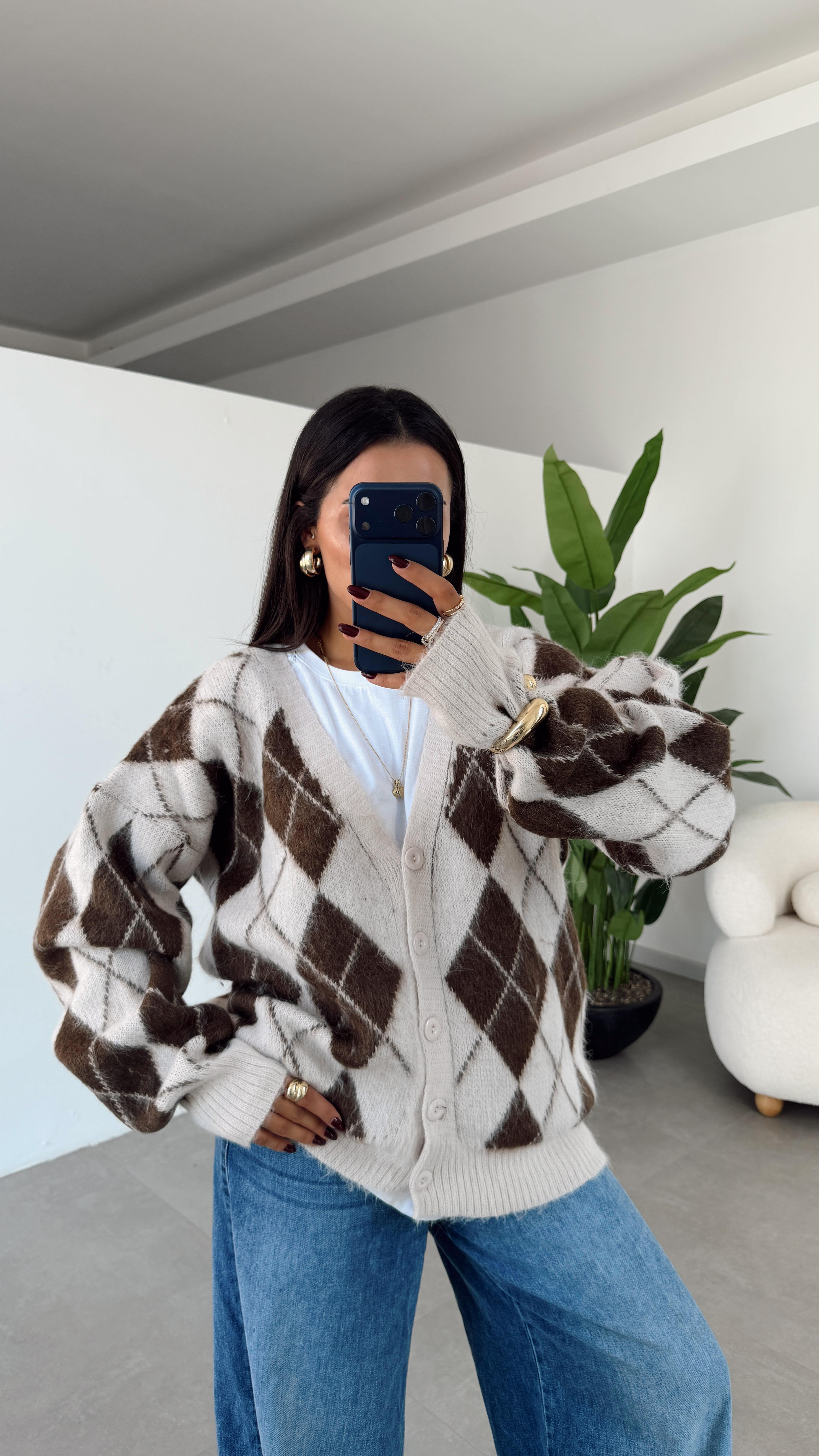 Ekru-Kahve Baklava Desenli Triko Hırka