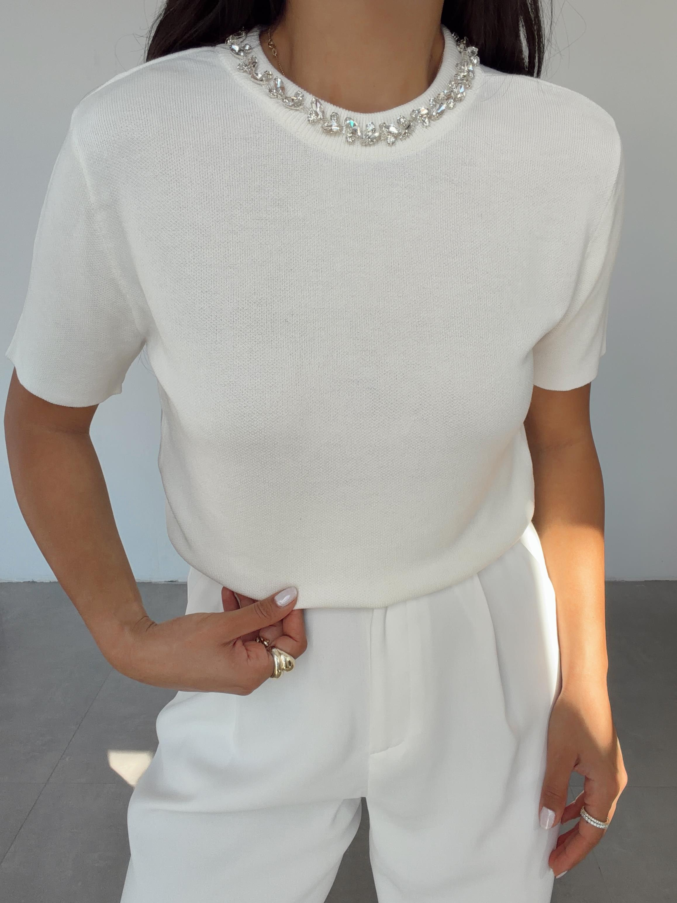 Ekru Yakası Taşlı Kısa Kol Kazak