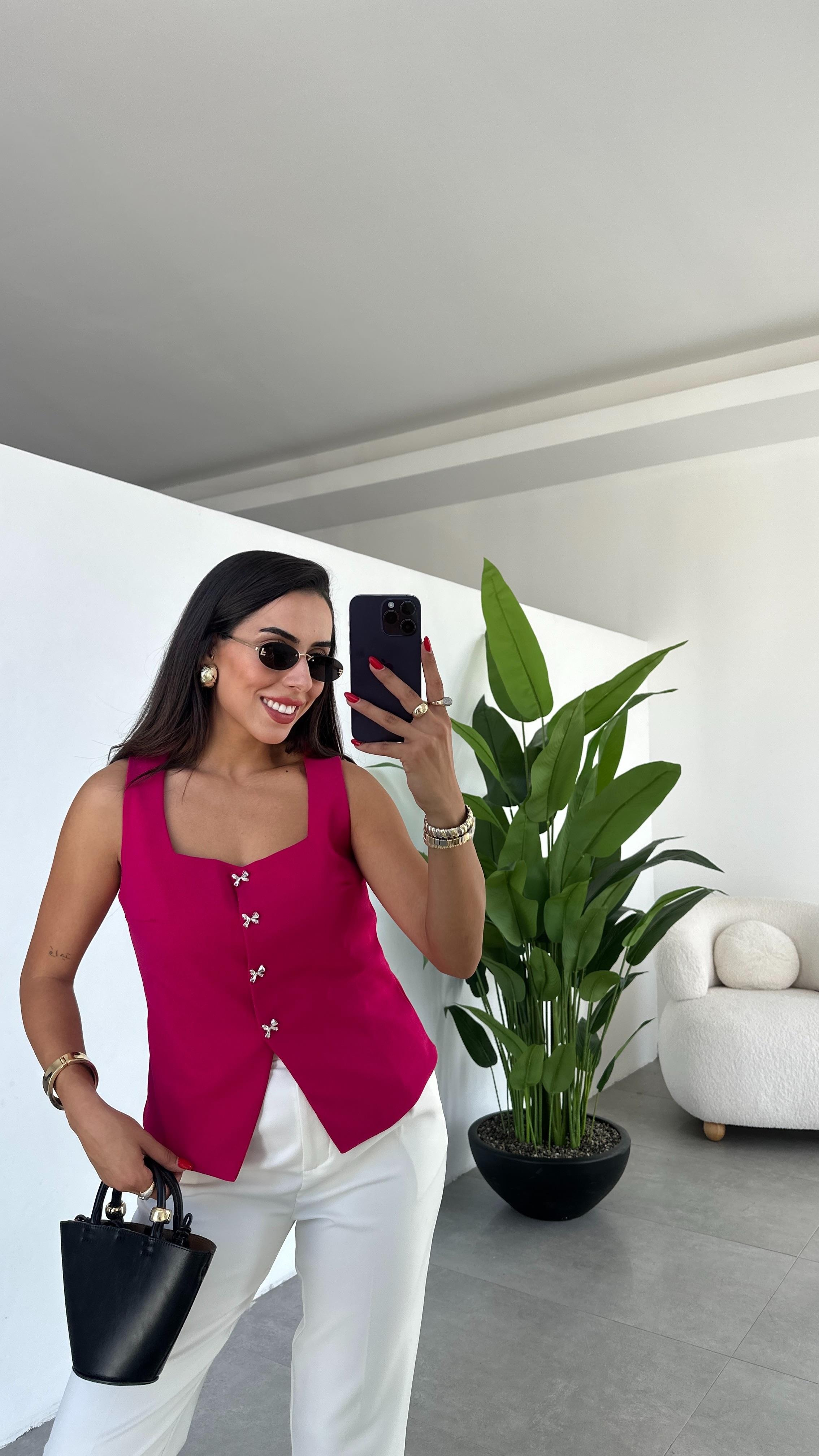 Kare yaka detayı ve ön kısmındaki metal düğmelerle feminen ve sofistike bir duruş sunar. Tok ve dökümlü kumaşı sayesinde hem vücudu toparlar hem de hatları zarifçe belirginleştirir.