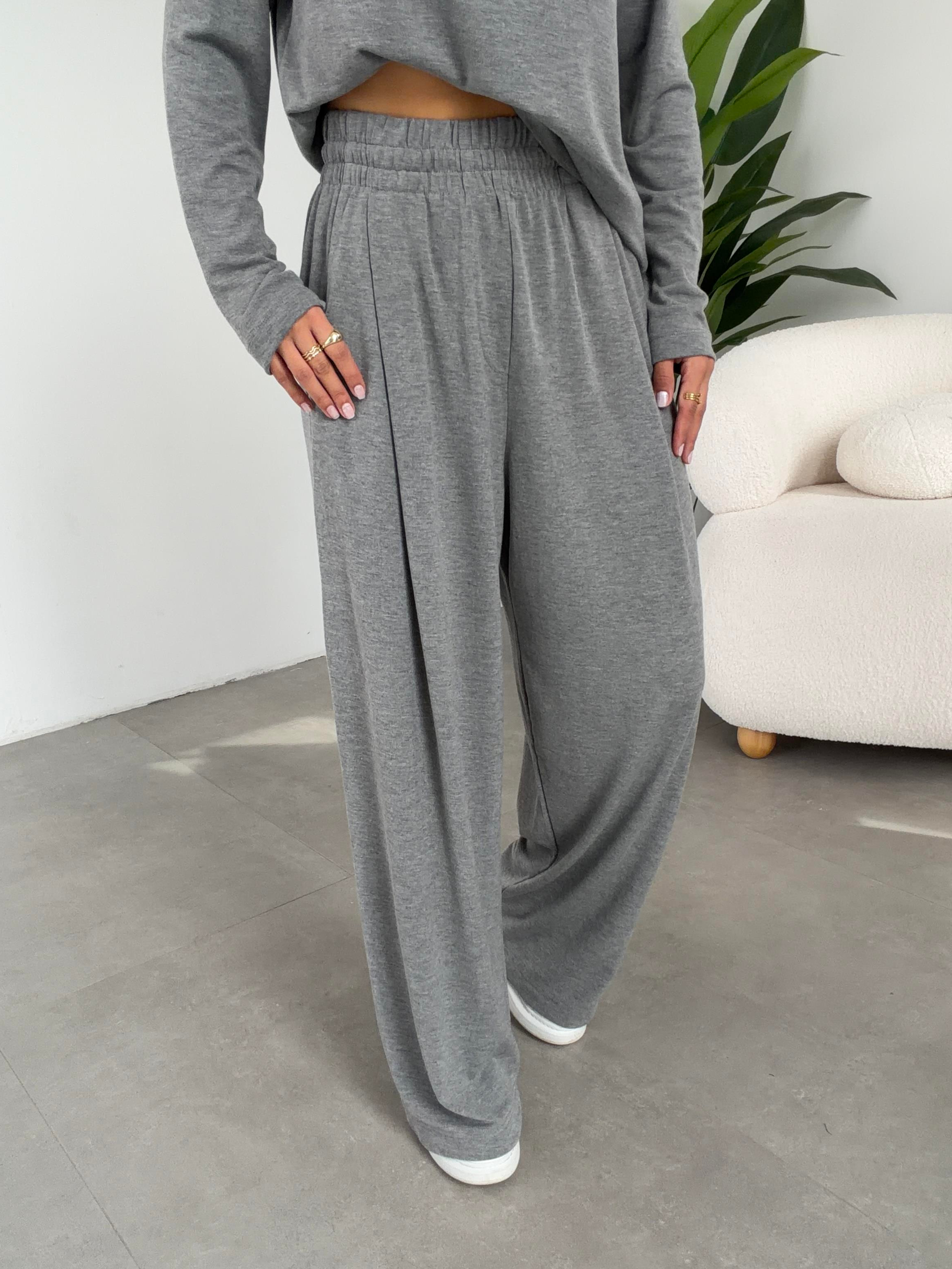 Akışkan kumaşı ve geniş paça kesimiyle zarif bir duruş sunan bu pantolon, gün boyu konfor sağlar. Lastikli bel detayıyla vücuda tam oturur, aynı zamanda hareket özgürlüğü sunar. Hem ev rahatlığında hem şehir stilinde kullanılabilir.