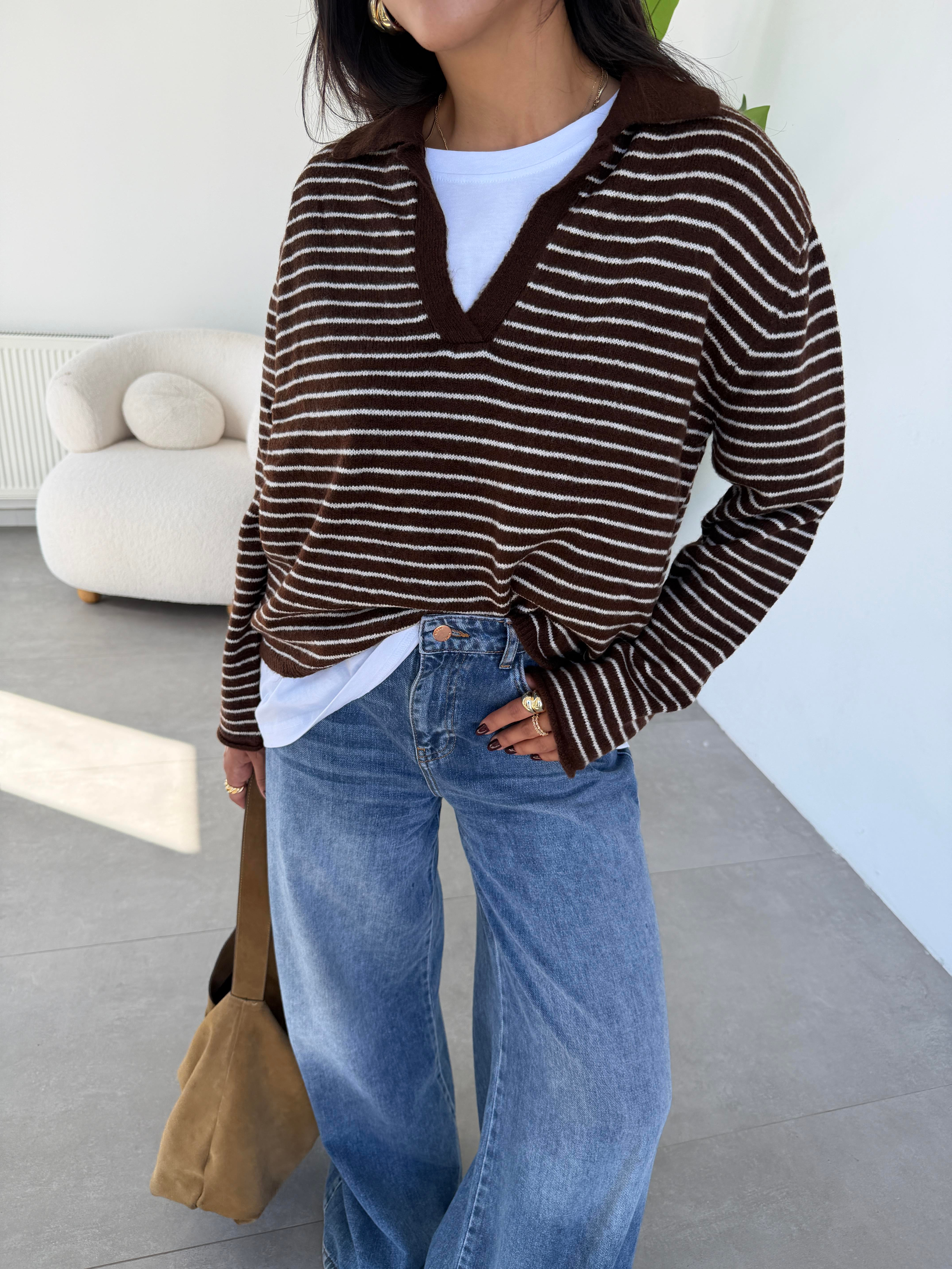 Kahve-Ekru Çizgili Polo Yaka Triko Kazak