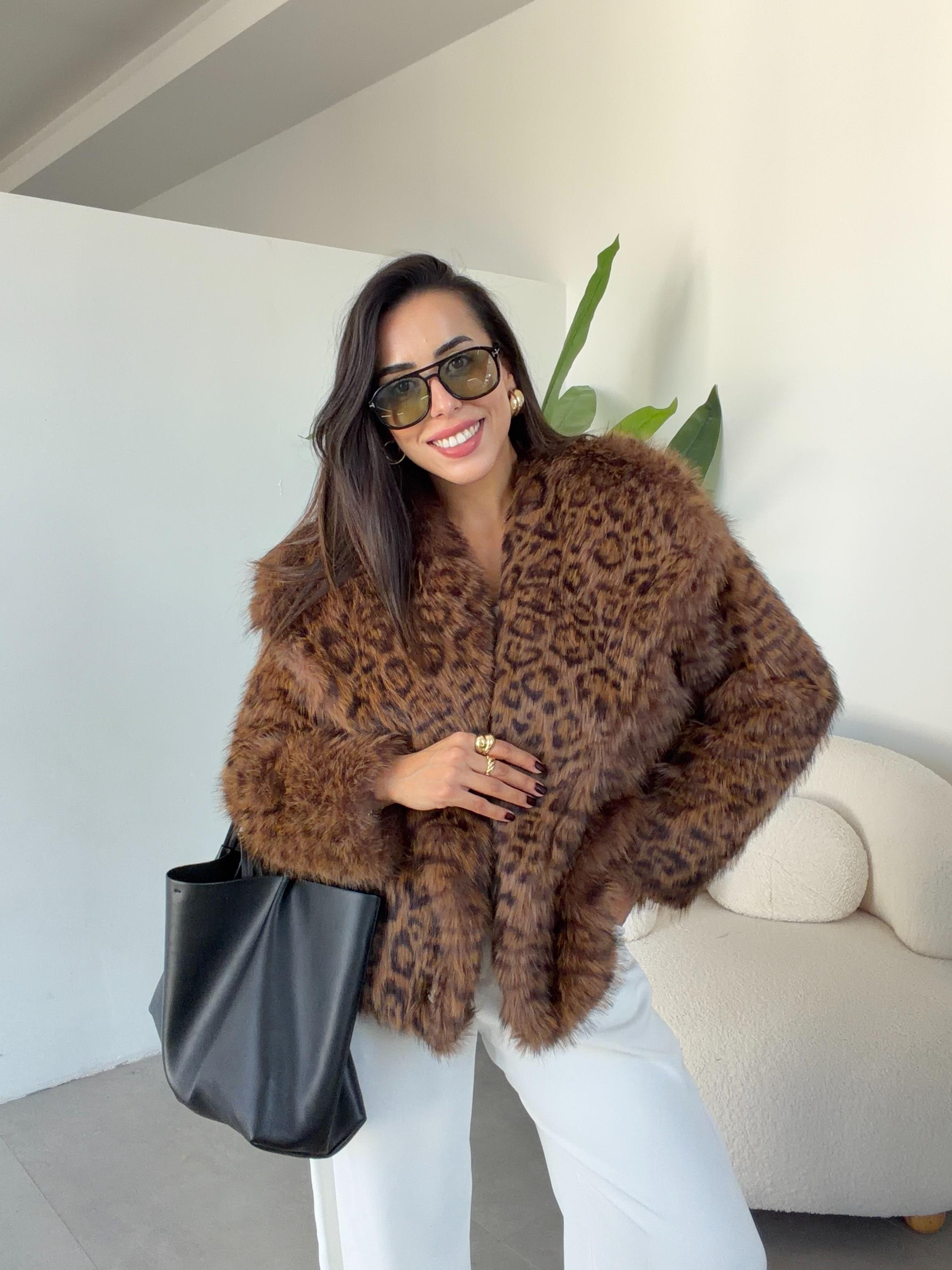 Soğuk havalara tarzıyla meydan okuyan leopar desenli suni kürk mont, hem sıcak tutan hem de iddialı duruşuyla kombinlerin yıldızı olmaya aday.