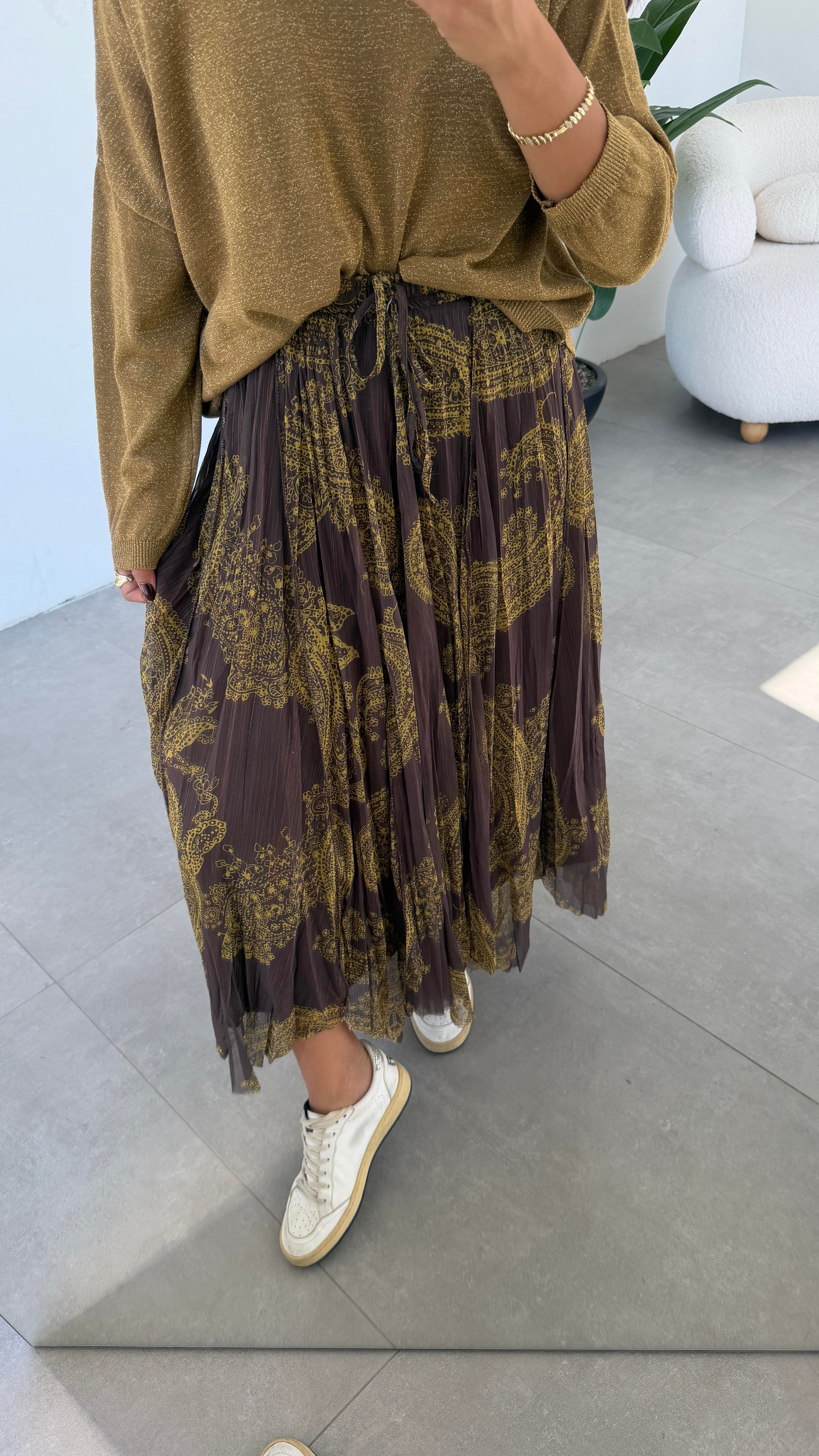 Şıklığı ve rahatlığı bir arada sunan desenli piliseli etek, özgün tasarımıyla gardırobunuzun favori parçalarından olacak. kahve zemin üzerine altın desenleriyle göz alıcı bir stil sunarken, piliseli tasarımı feminen ve hareketli bir görünüm kazandırır. Bel kısmındaki lastik ve bağcık detayı sayesinde hem şık hem de rahat bir kullanım sağlar.
