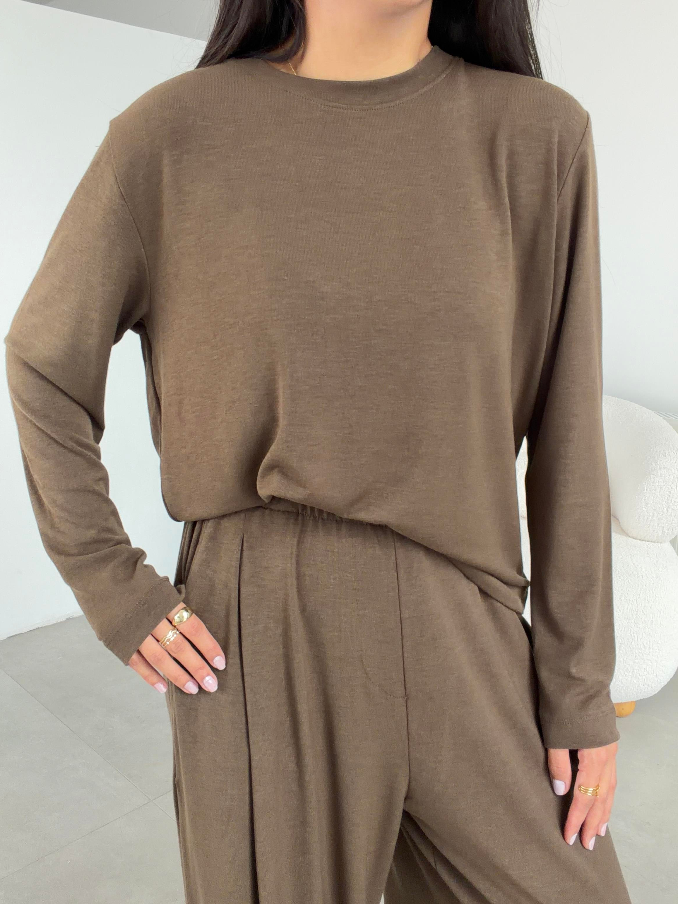 Kahve Sonsuz Kumaş Uzun Kollu Bluz