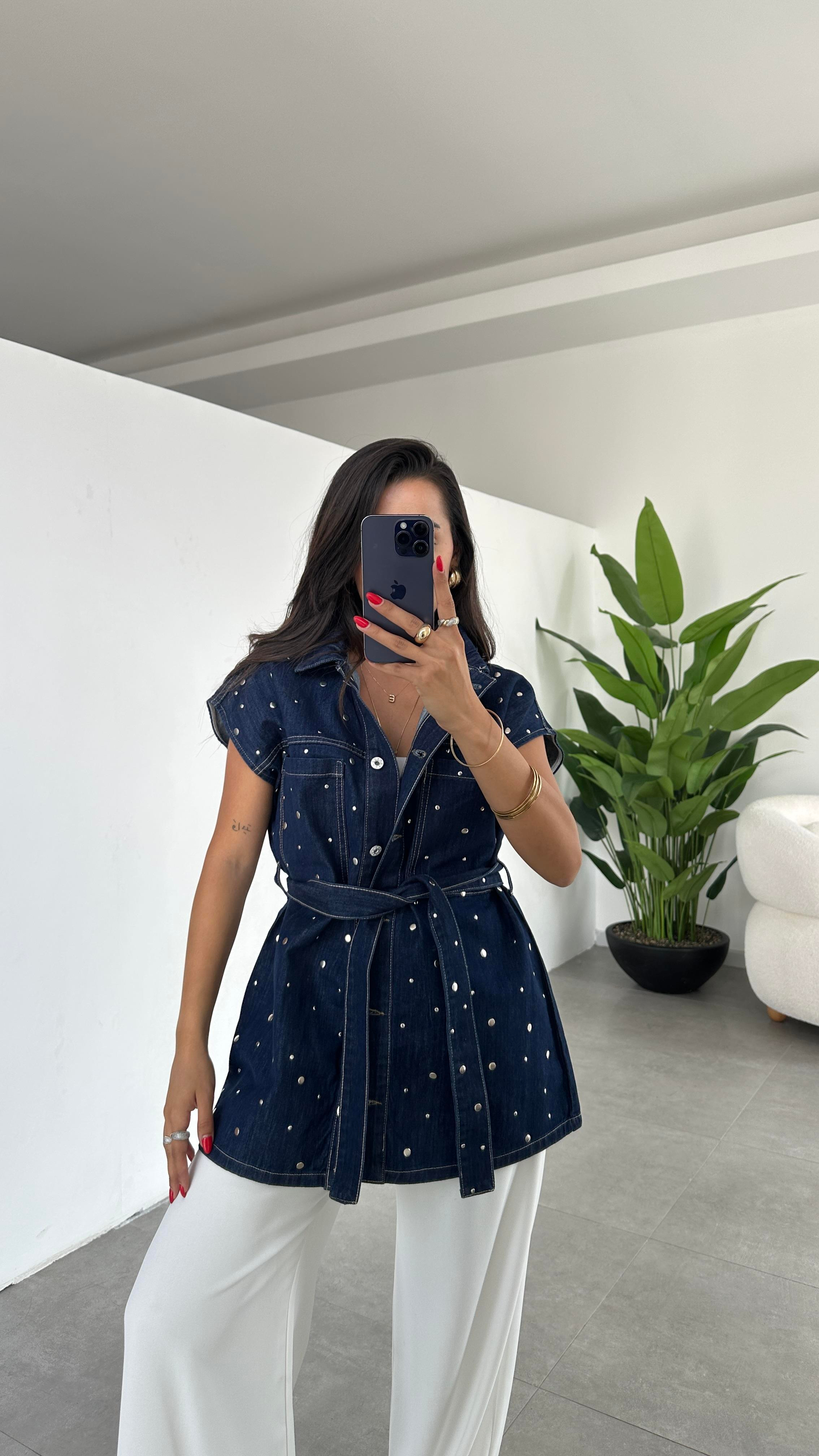 Lacivert Beli Kuşaklı Drop Çakımlı Kot Yelek