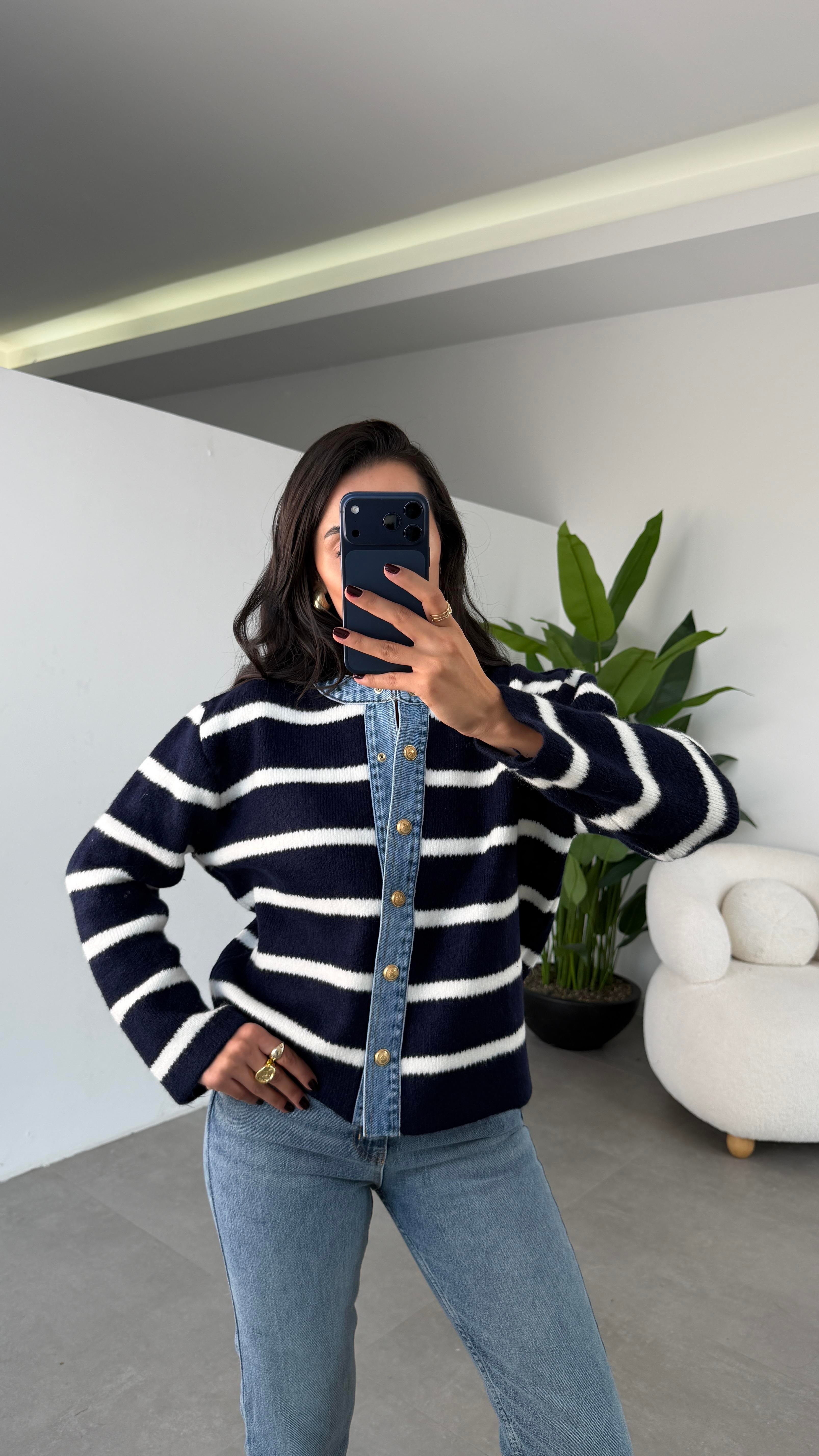 Denim detaylı triko hırka, sezonun trend parçası! Yumuşak dokusu ve altın düğme detaylarıyla şıklığı öne çıkarır. Standart bedeniyle 36-42 arası uyumludur. Jean pantolonlar, etekler veya basic parçalarla kolayca kombinlenir.