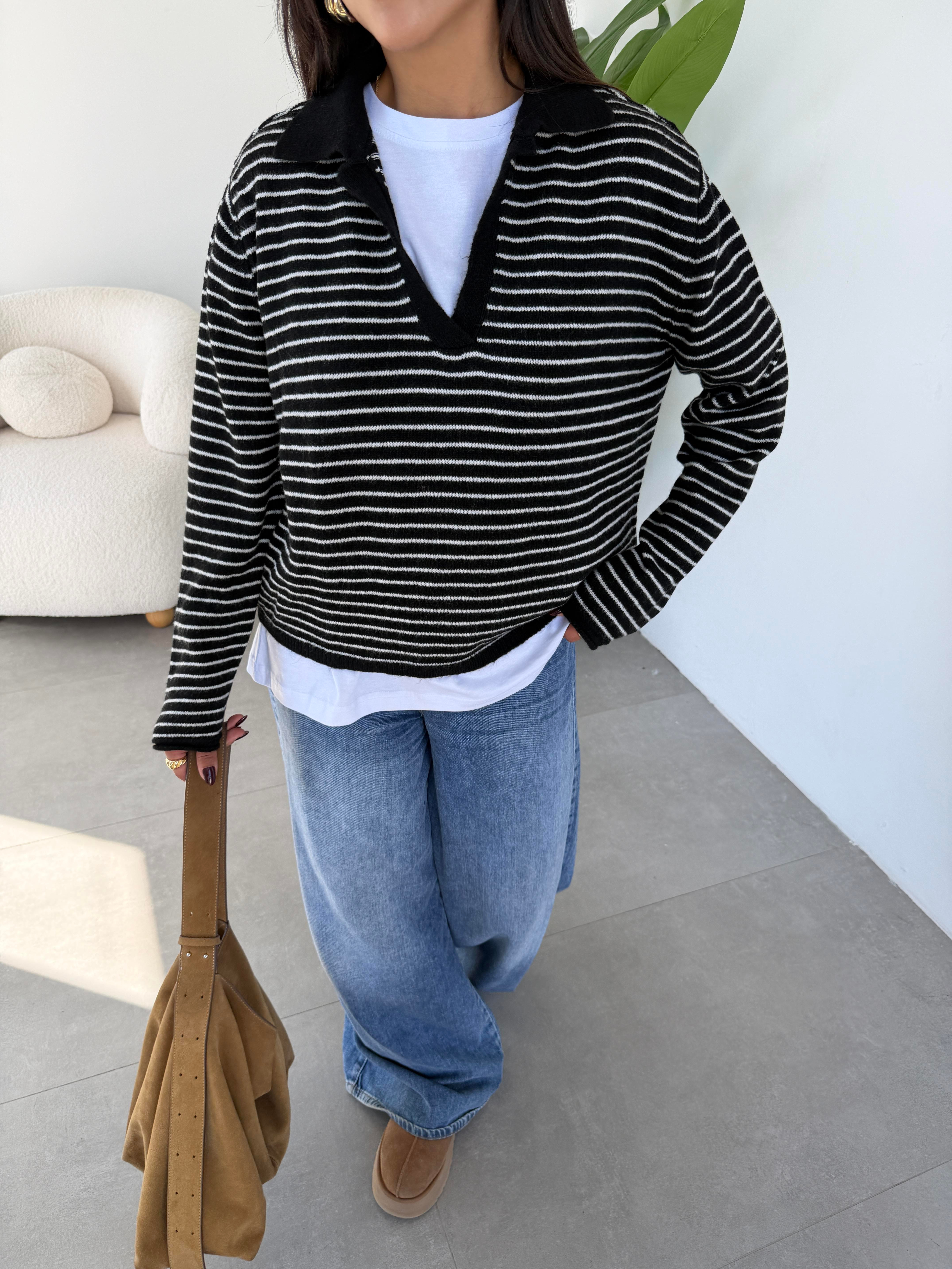 Siyah-Ekru Çizgili Polo Yaka Triko Kazak
