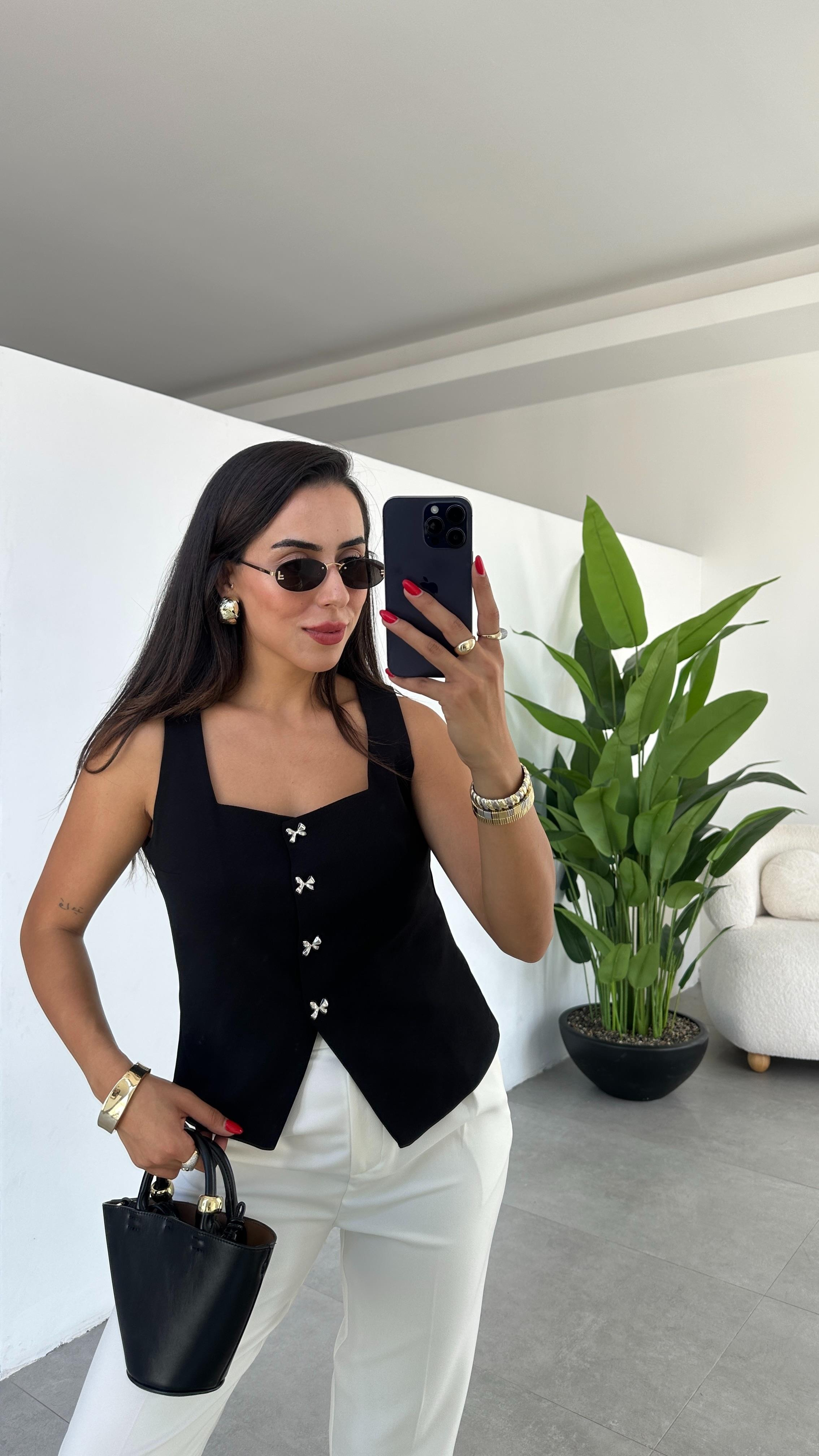 Kare yaka detayı ve ön kısmındaki metal düğmelerle feminen ve sofistike bir duruş sunar. Tok ve dökümlü kumaşı sayesinde hem vücudu toparlar hem de hatları zarifçe belirginleştirir.