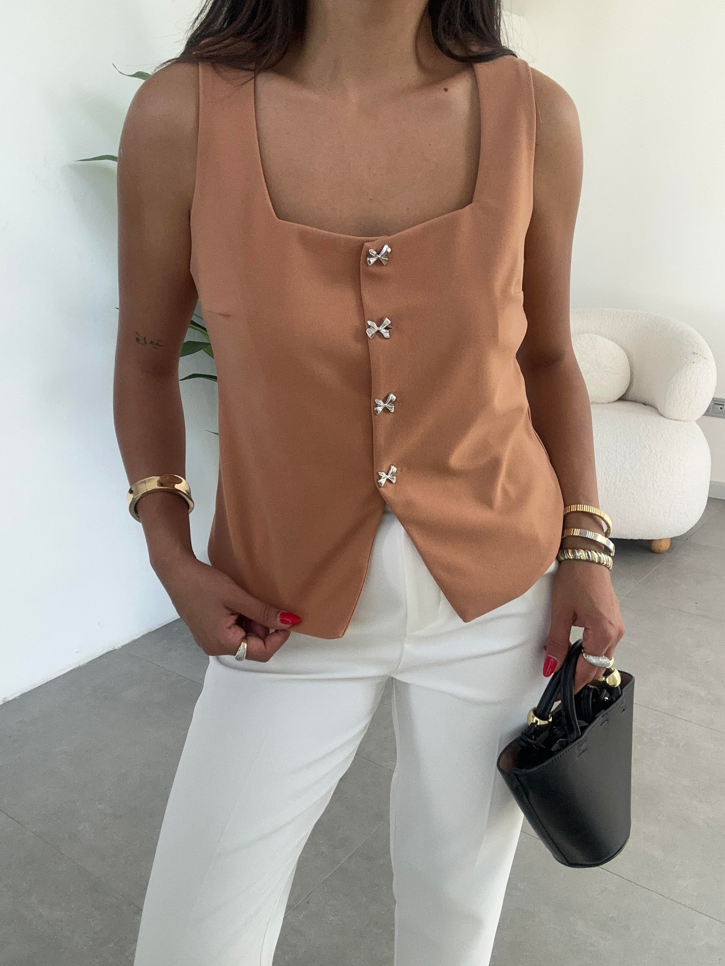 Kare yaka detayı ve ön kısmındaki metal düğmelerle feminen ve sofistike bir duruş sunar. Tok ve dökümlü kumaşı sayesinde hem vücudu toparlar hem de hatları zarifçe belirginleştirir.