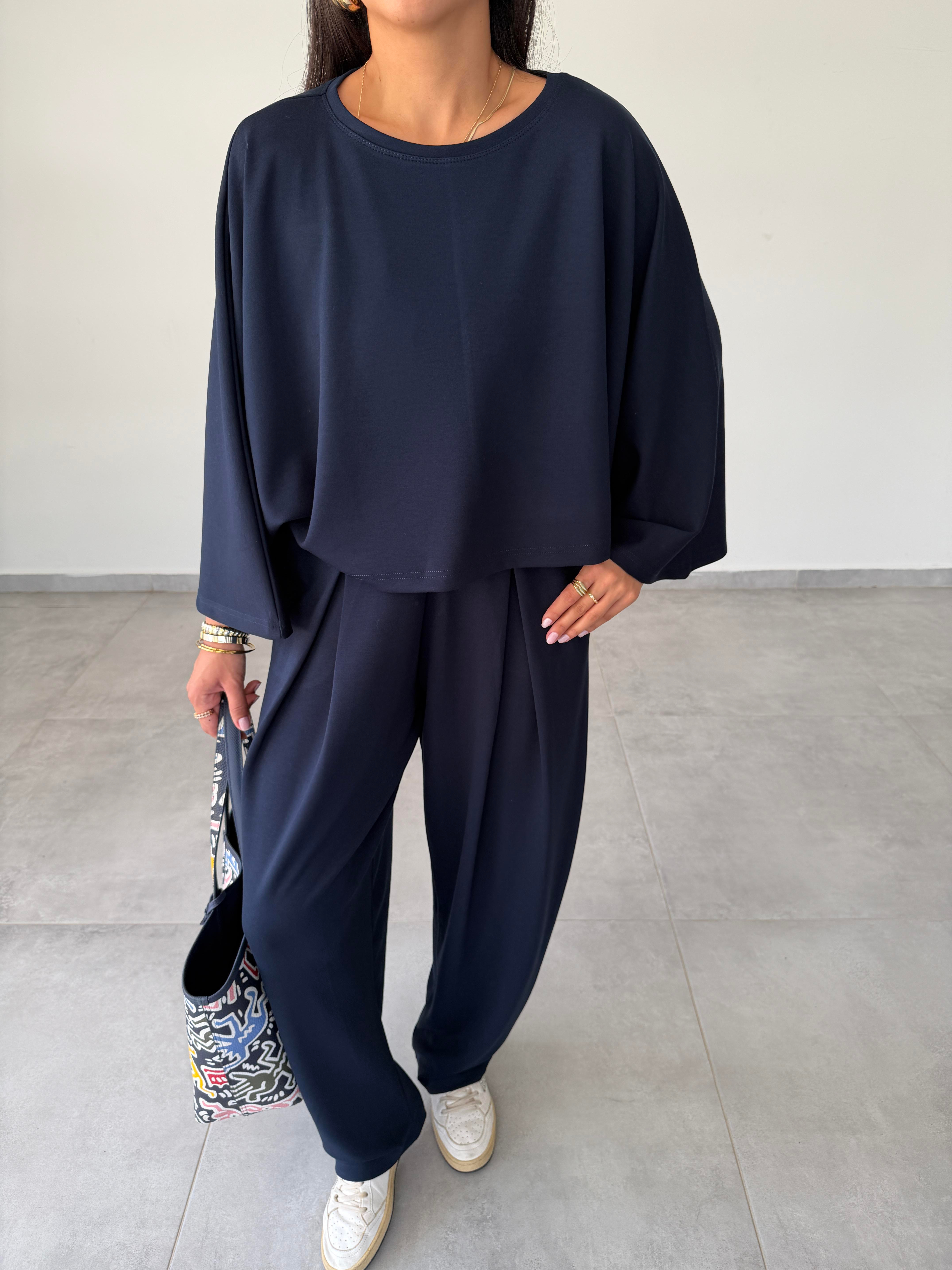 Viya Lacivert Yarasa Kol Crop Önü Pile Şalvar Pantolon Takım
