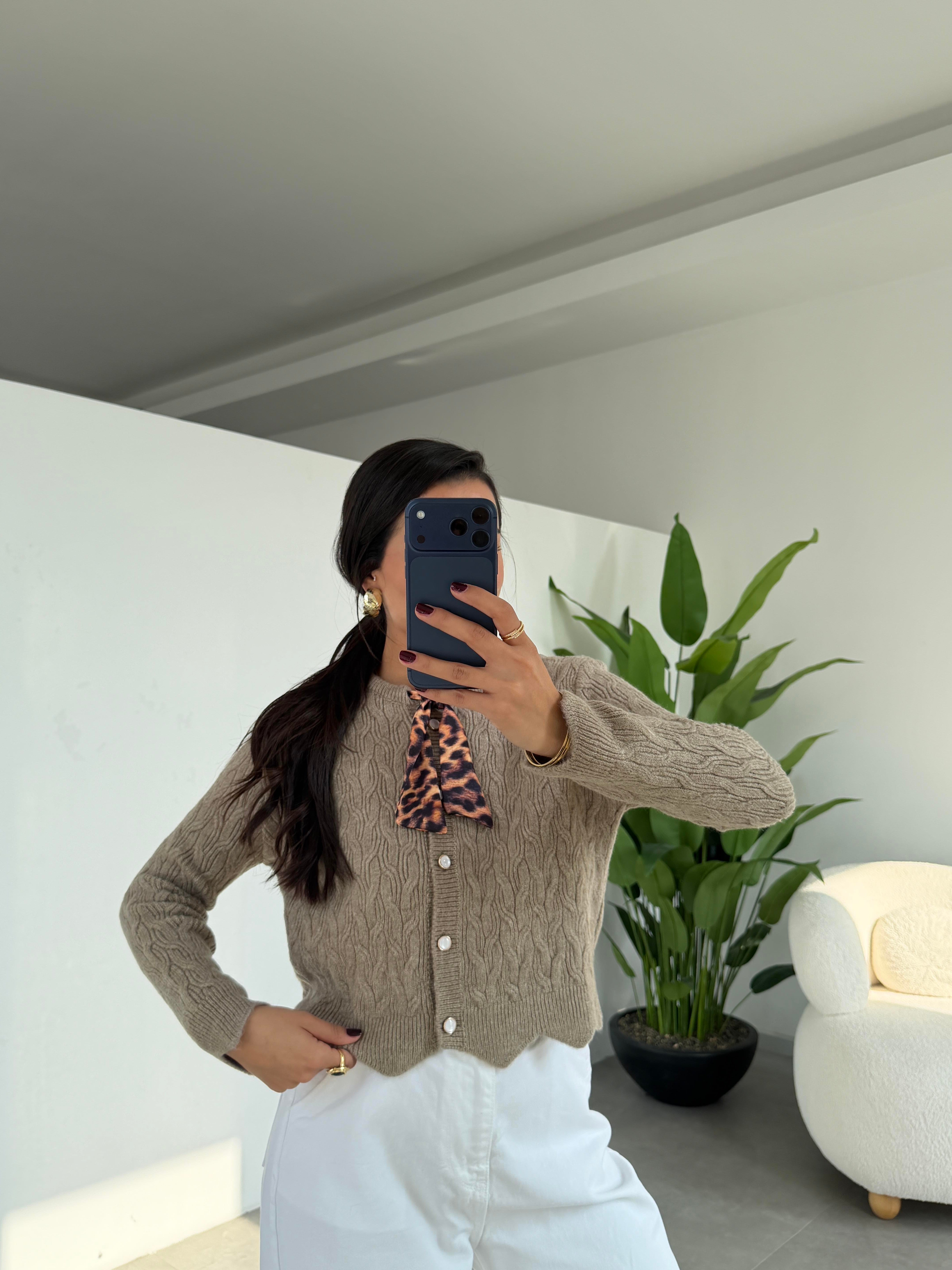 Yumuşacık örgü kumaşı, inci düğmeleri ve zarif leopar desenli fuları ile feminen bir zarafet sunar.