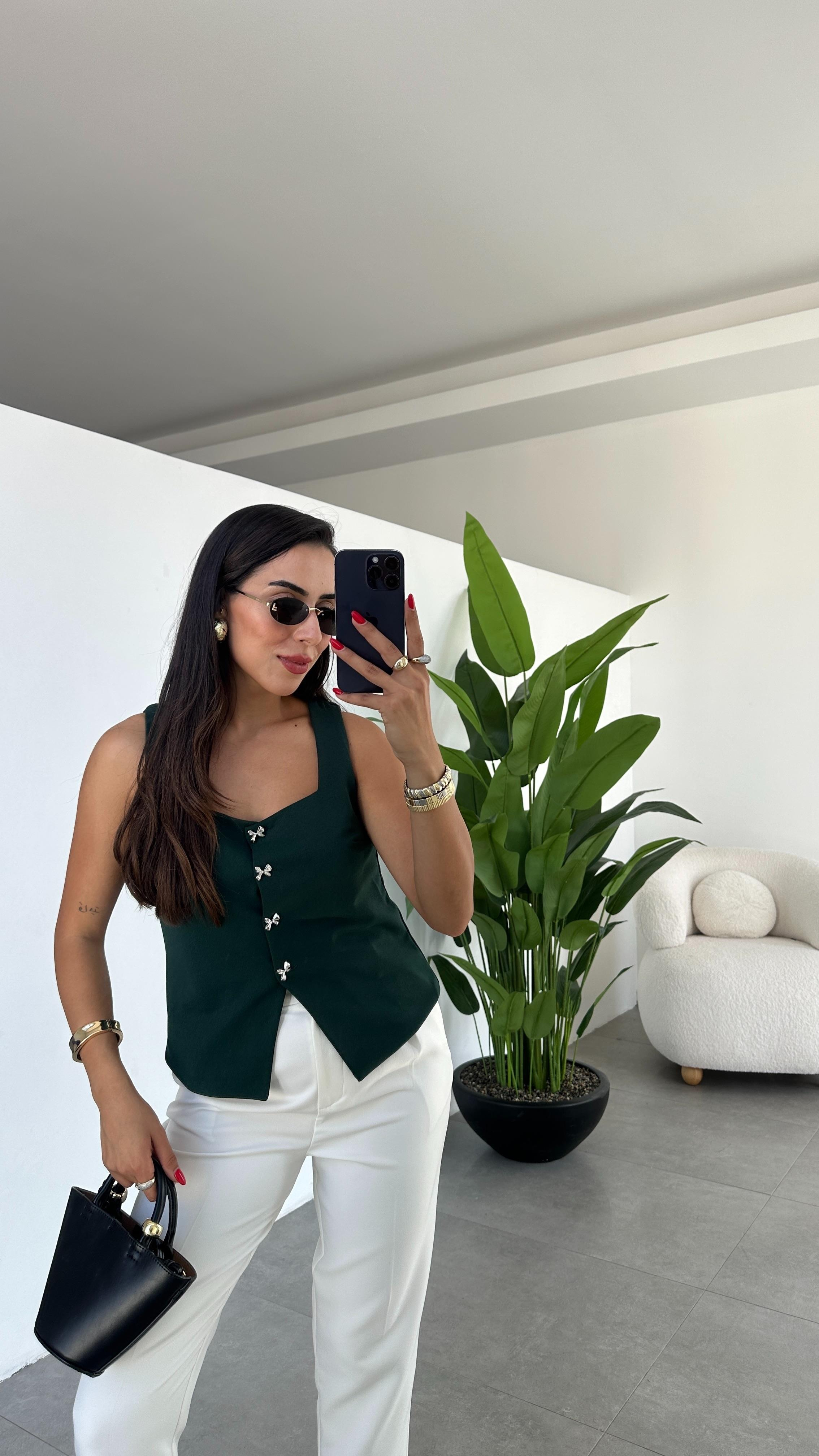 Kare yaka detayı ve ön kısmındaki metal düğmelerle feminen ve sofistike bir duruş sunar. Tok ve dökümlü kumaşı sayesinde hem vücudu toparlar hem de hatları zarifçe belirginleştirir.